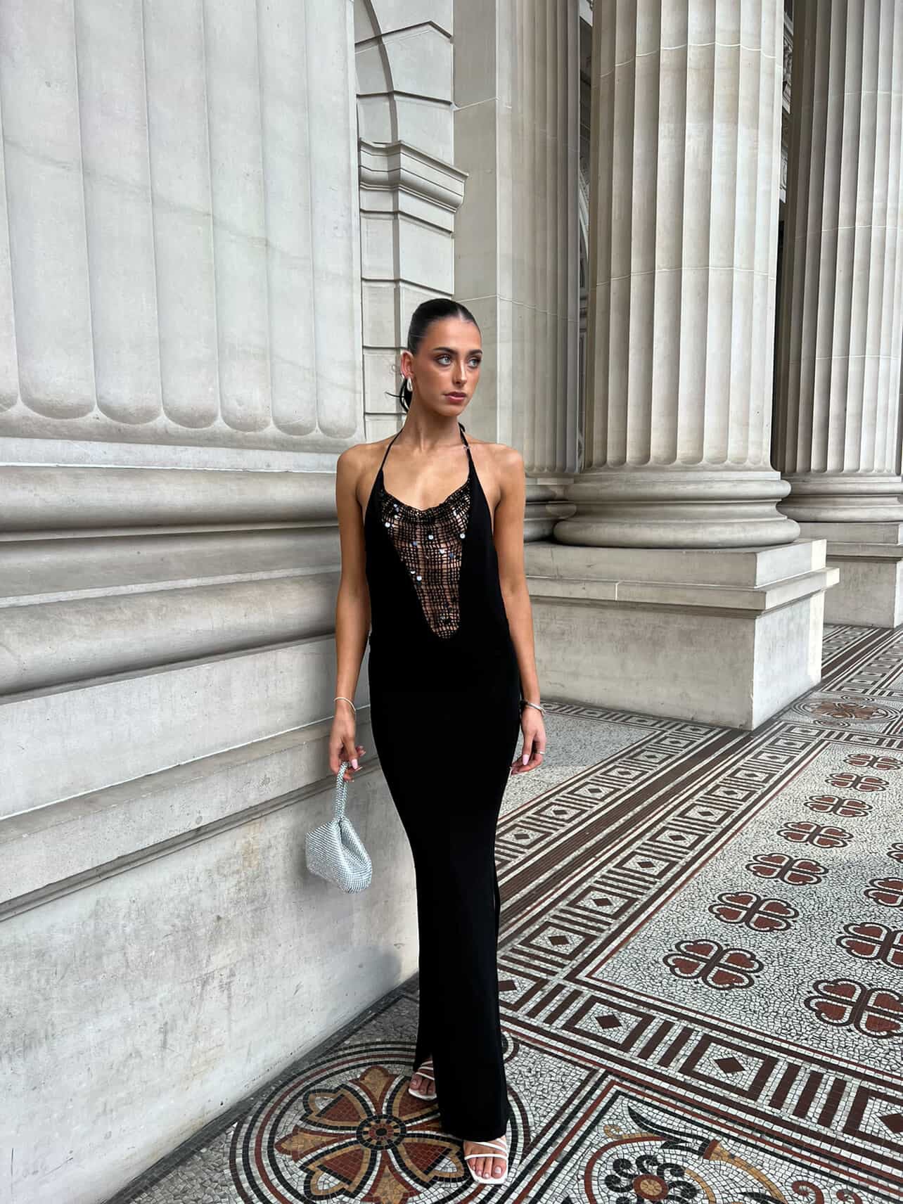 This dress is backless, with a plunging sequin neckline. Straps are adjustable and sides are split.