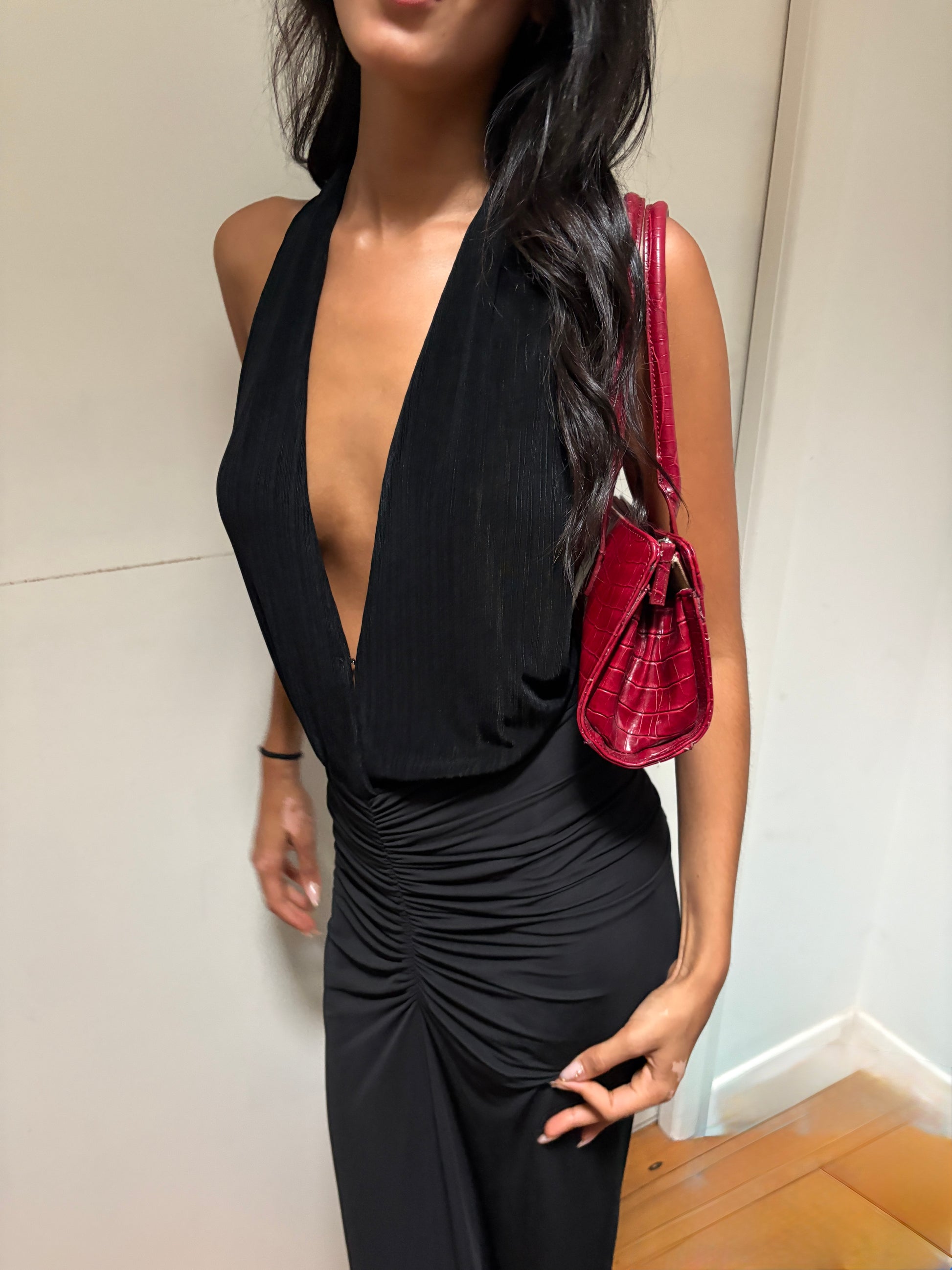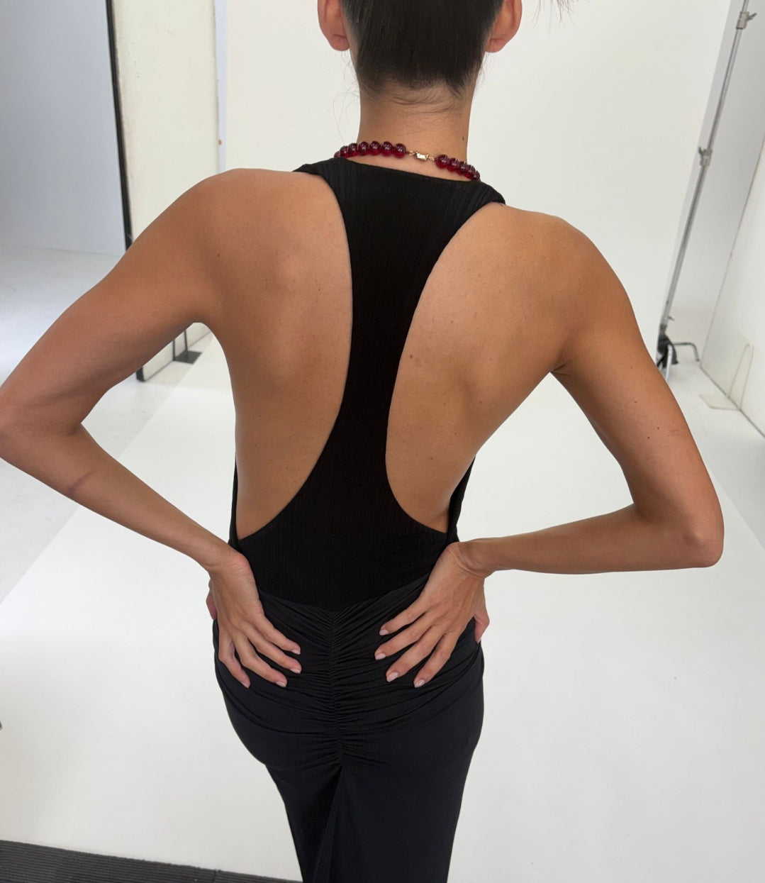 This dress features a deep plunge neckline with a racer back design. Ribbed fitted bodice with ruching at the front and back for contouring.
