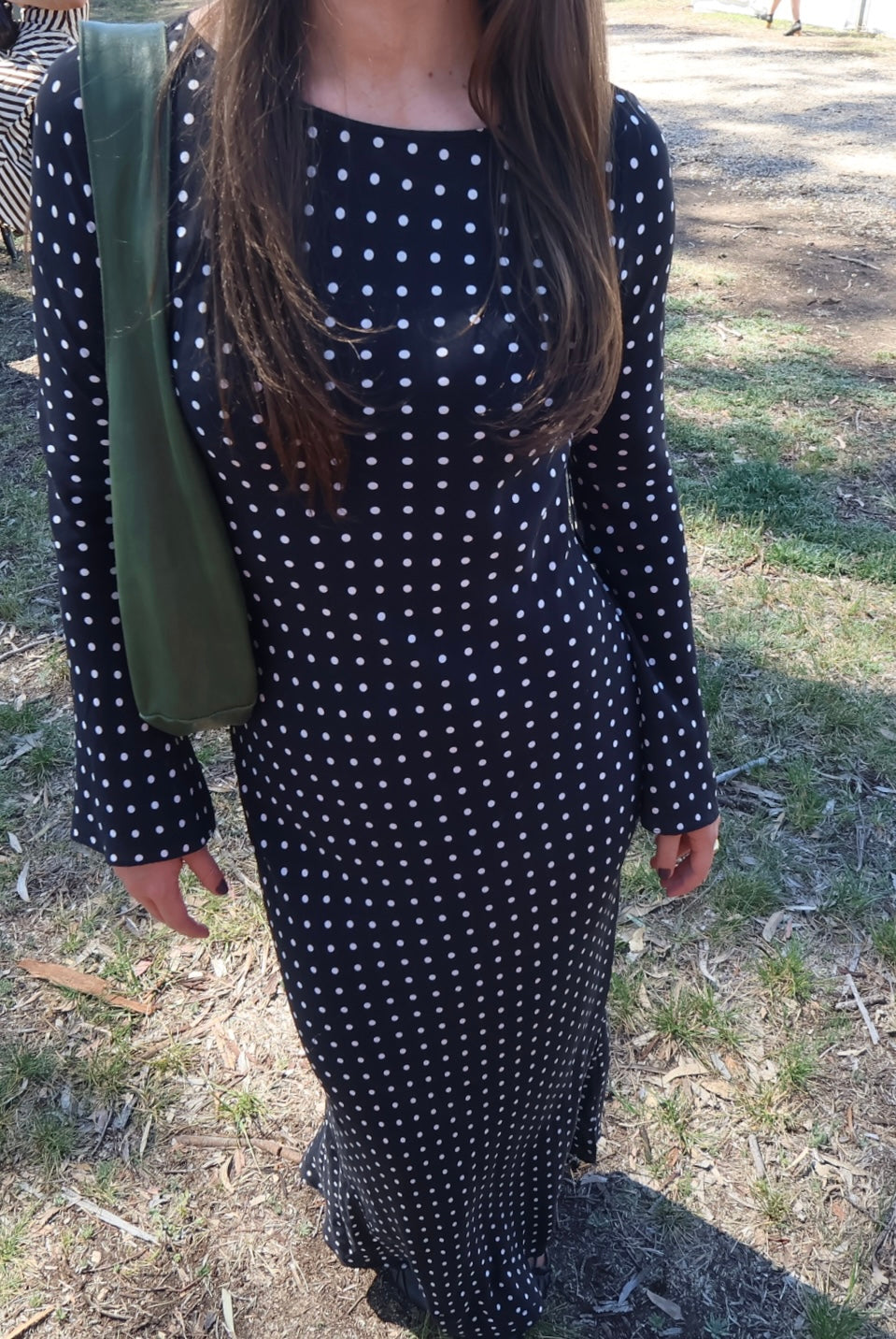 A full length, bias cut maxi dress with bell sleeves.